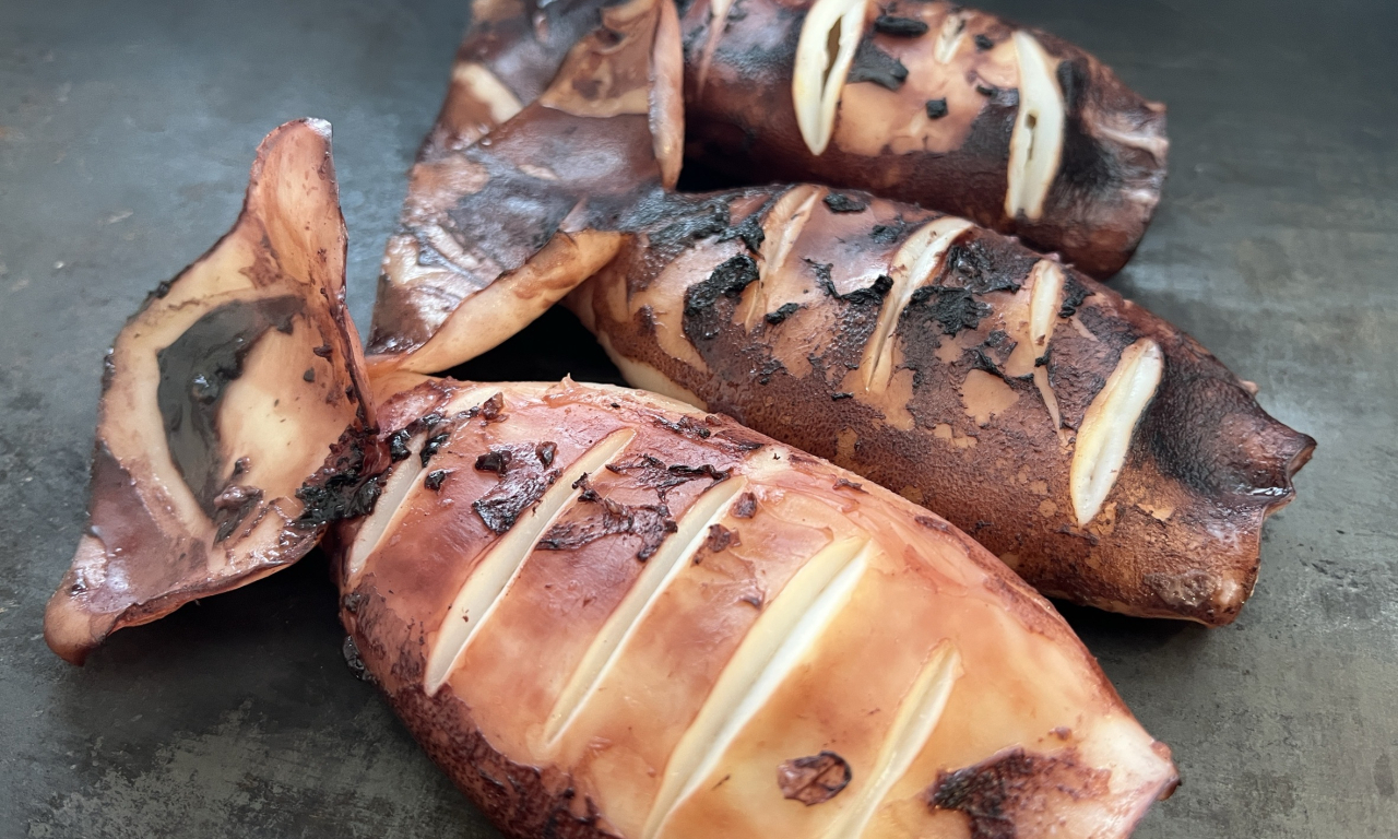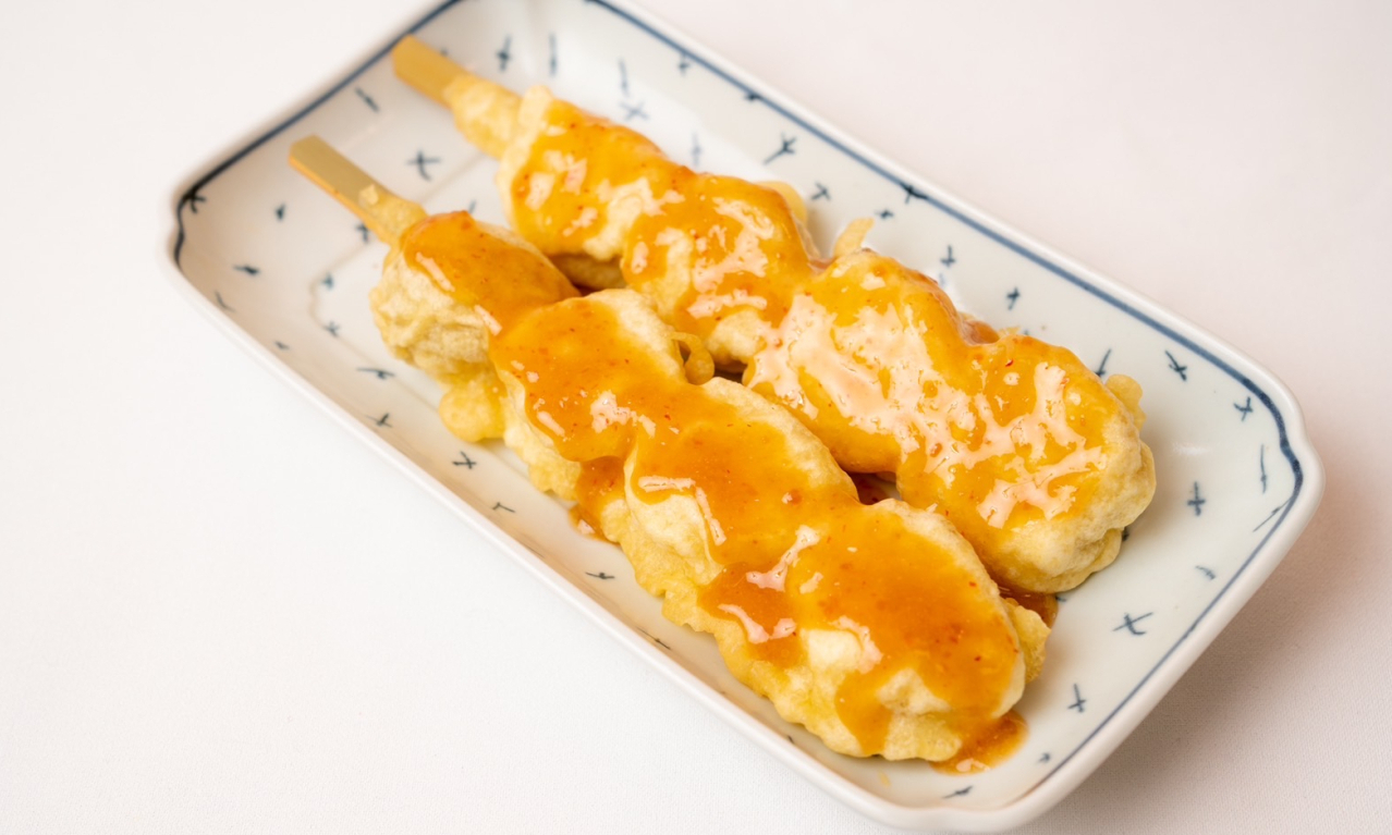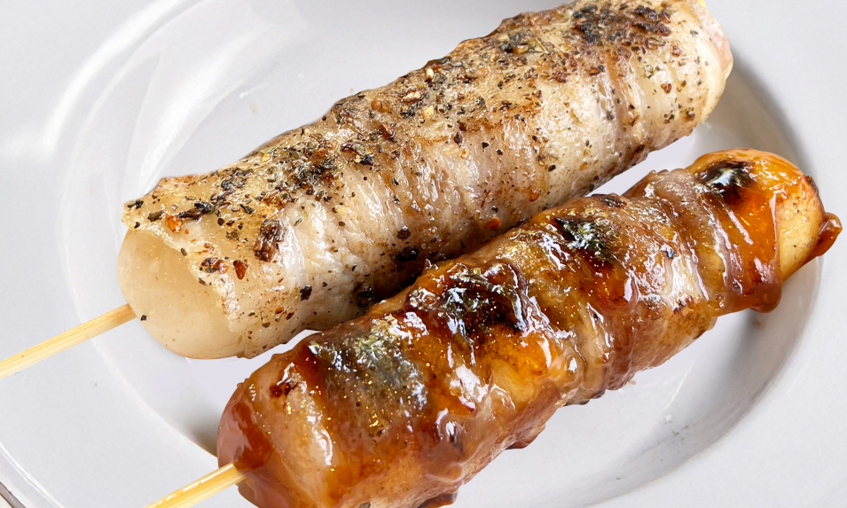 美味しい白玉団子に豚バラ肉を巻き付けじっくりと炭火で焼き上げました。たっぷり絡めて味わい深さが広がるオリジナルのタレ味と豚肉の旨味が広がるこだわりぬいた塩味。2種それぞれの味をご賞味ください。